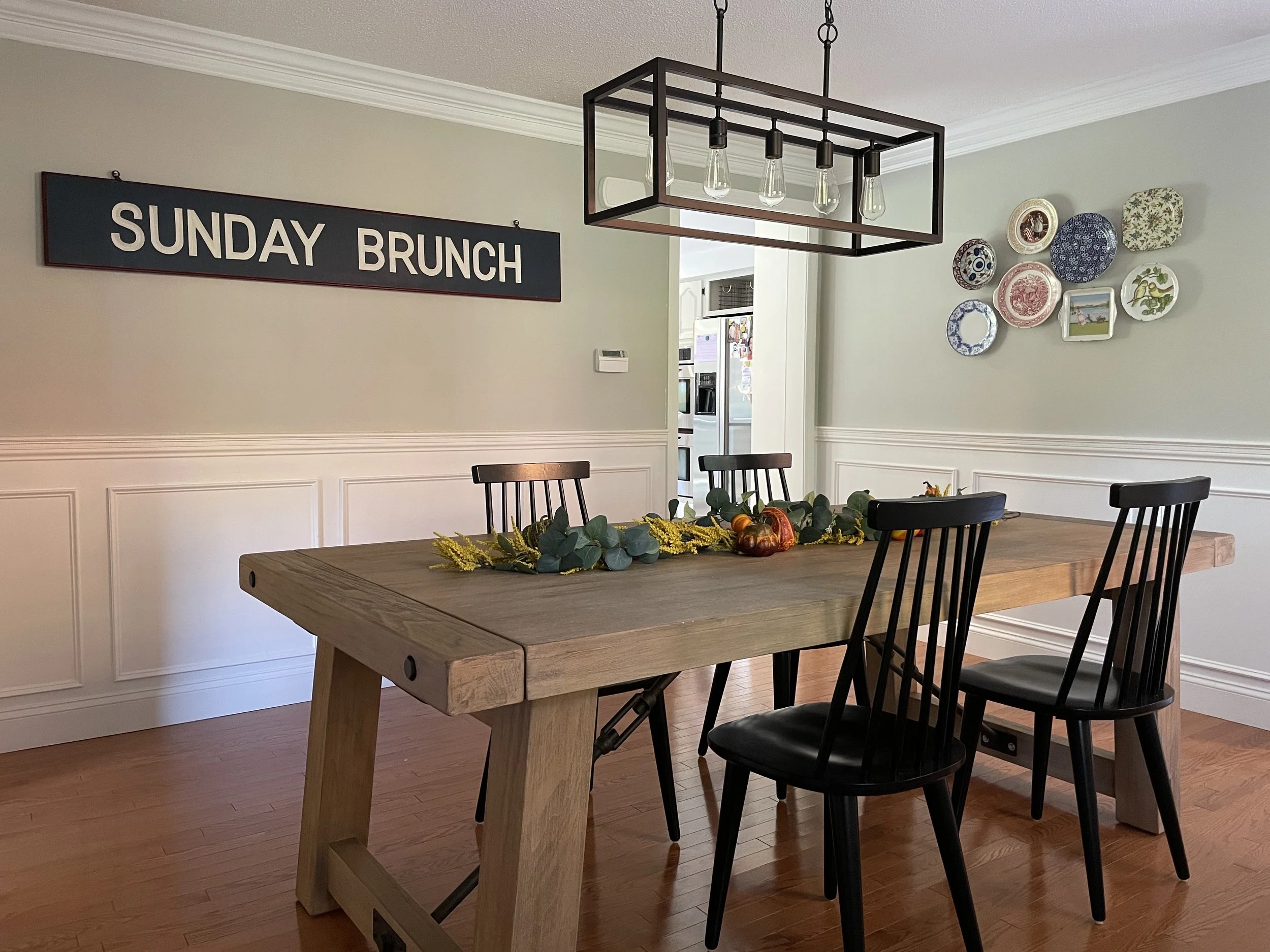 As we embrace nostalgia, vintage and antique decor items are making a comeback. This fall we will see a blend of old and new, with homeowners curating unique collections that tell a story. Incorporate vintage furniture, artwork, or decorative objects to add character and depth to your space. Mixing these elements with contemporary pieces creates an eclectic yet harmonious look. It’s about celebrating history while embracing modernity, making your home feel both lived-in and stylish. A few of my favorite antique pieces in my home include a gallery wall of vintage plates I curated from a local antique store, a vintage wooden ice chest that we use to store my daughters puzzles and art materials and this incredible wooden sign from an old restaurant that says “Sunday Brunch” that hangs in our dining room.